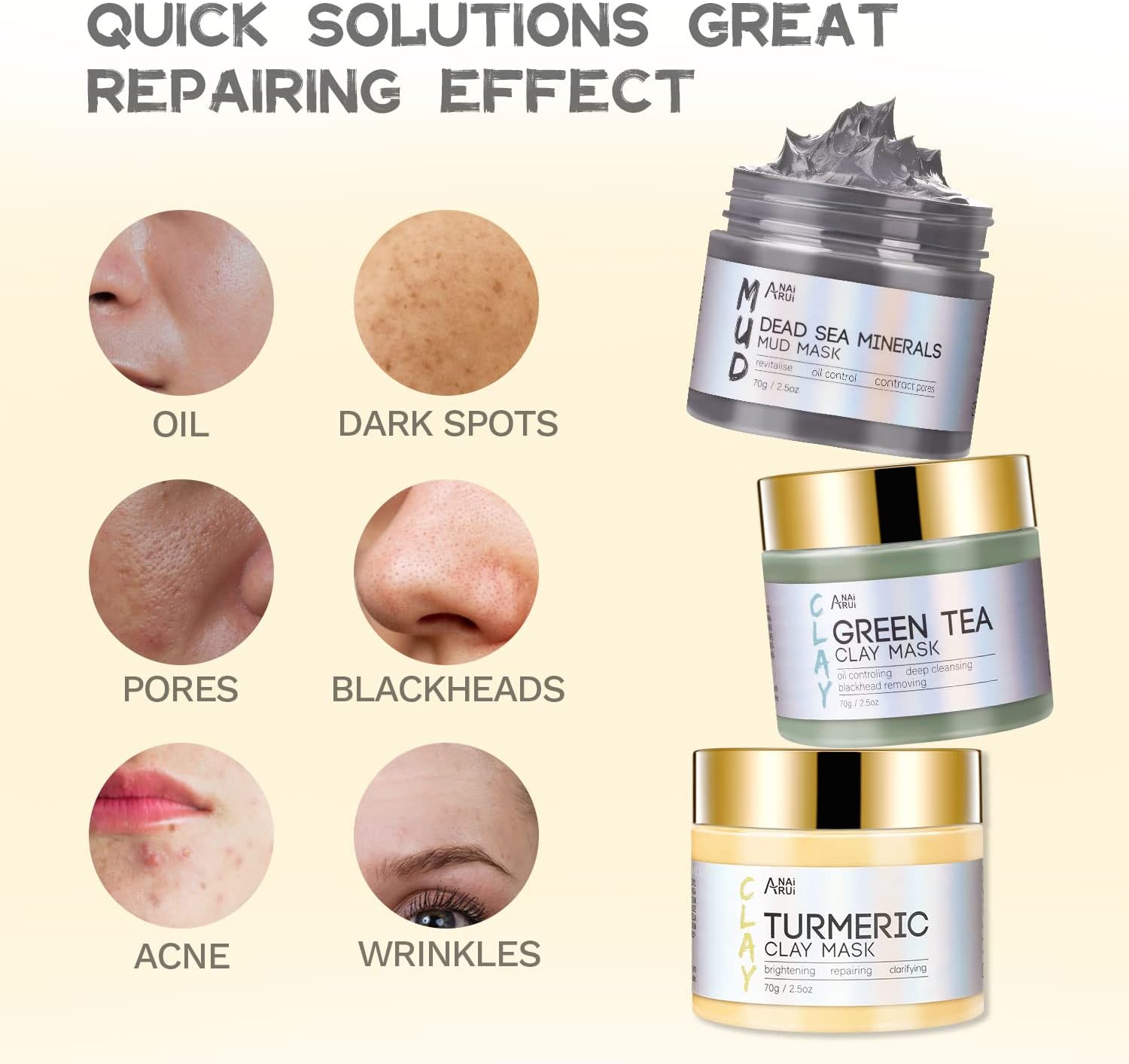 Indulge in a luxurious spa-like experience with the ANAI RUI Turmeric Clay Mask, Green Tea Clay Mask, and Dead Sea Minerals Mud Mask set. Each mask is formulated with natural ingredients to help detoxify, brighten, and rejuvenate your skin.