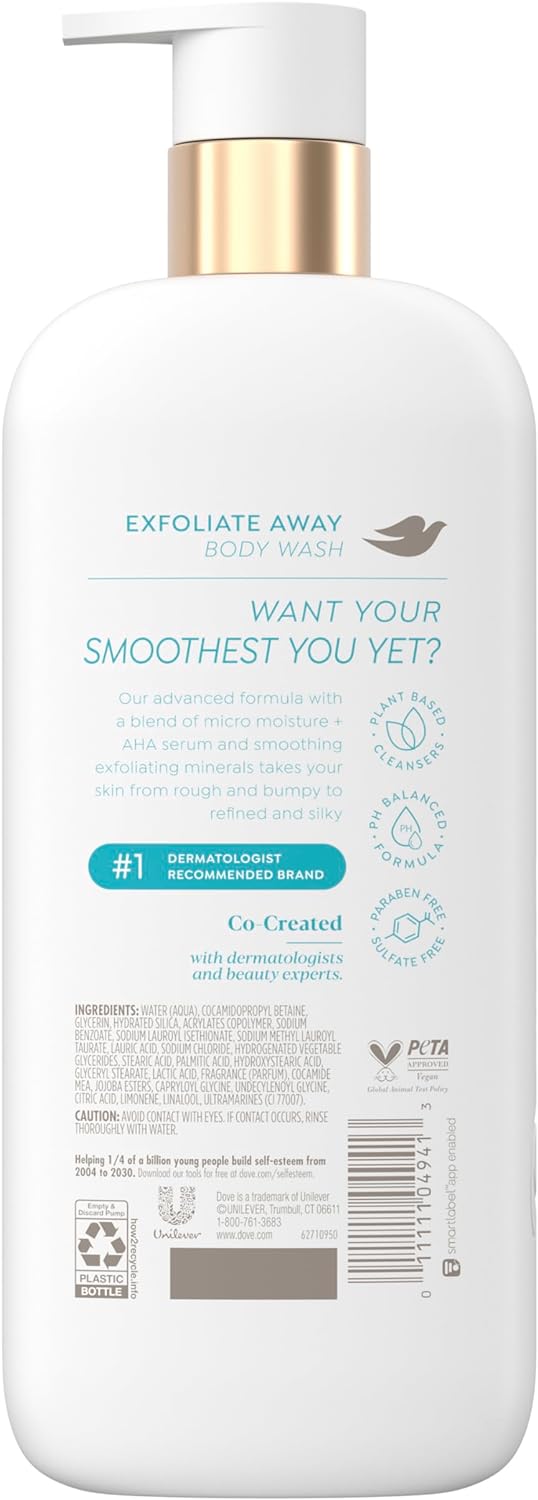 Dove Body Wash Exfoliate Away Micro-polishes for silkier skin 4% refining serum with AHA 18.5 oz