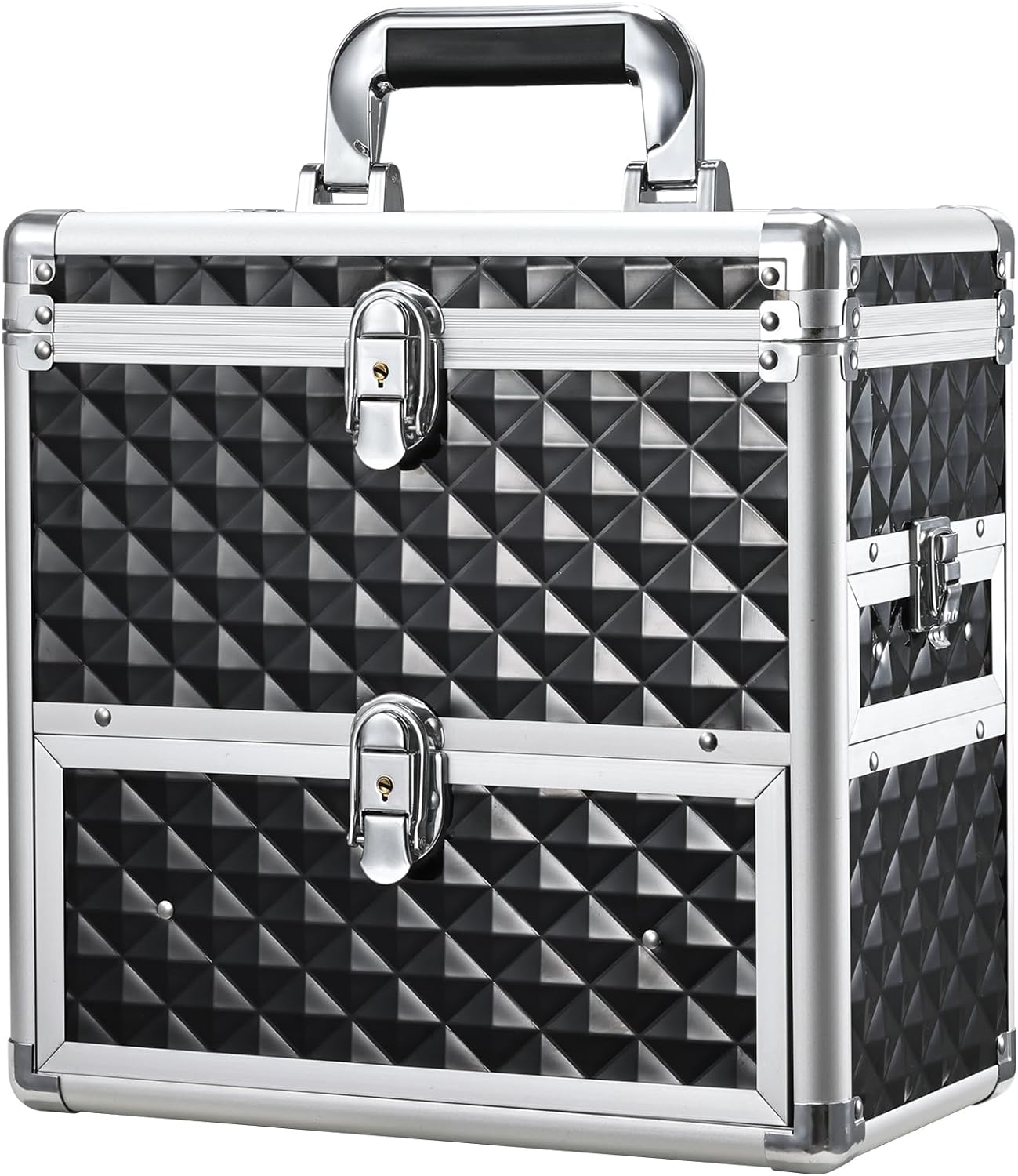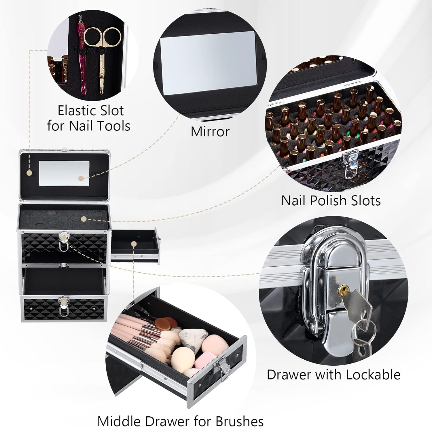 Frenessa Nail Polish Makeup Train Case with Drawer and Dividers Manicure Organizer Accessory Storage Makeup Box With Mirror Lockable Keys Nail Kit Organizer Cosmetic Case Jewelry Box – Black