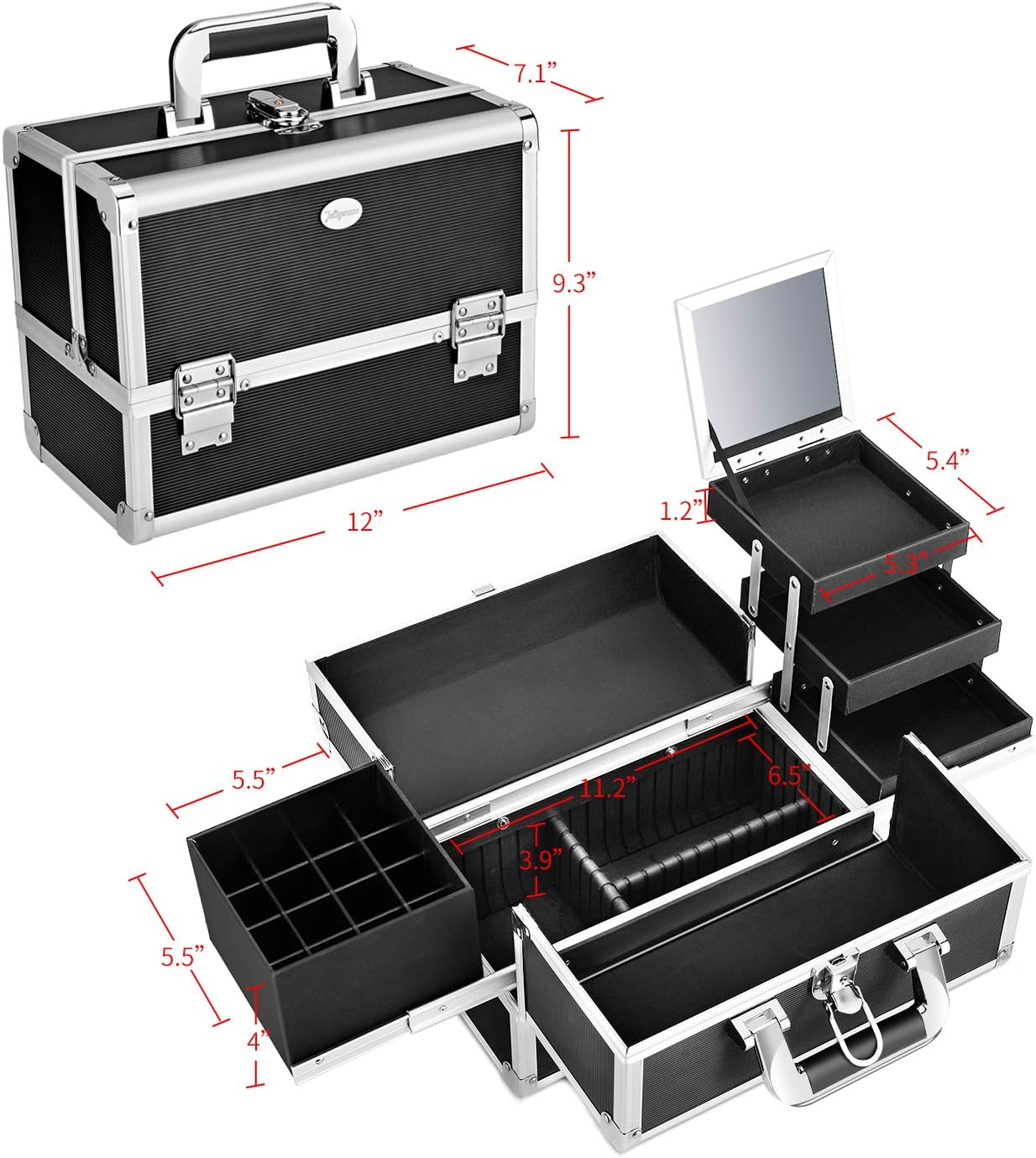 Joligrace Makeup Train Case Organizer Box Professional Multi-Purpose Cosmetic Storage with Sliding Trays, Polish Slots & Mirror, Portable Lockable with Keys, Large Black